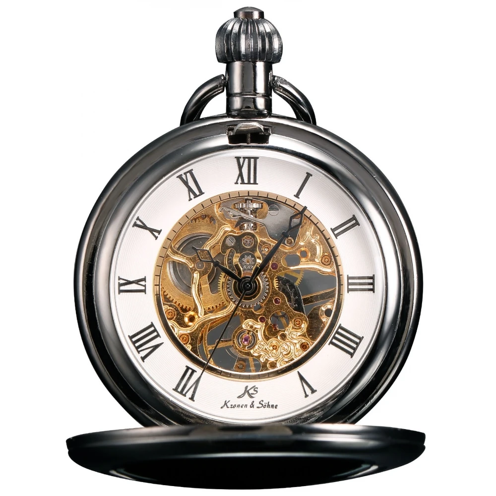 KS Steampunk Watches Hand Winding Retro Gun Tone Skeleton Roman Numerals Fob Pendant Chains Mechanical Pocket Watch Gift /KSP006
