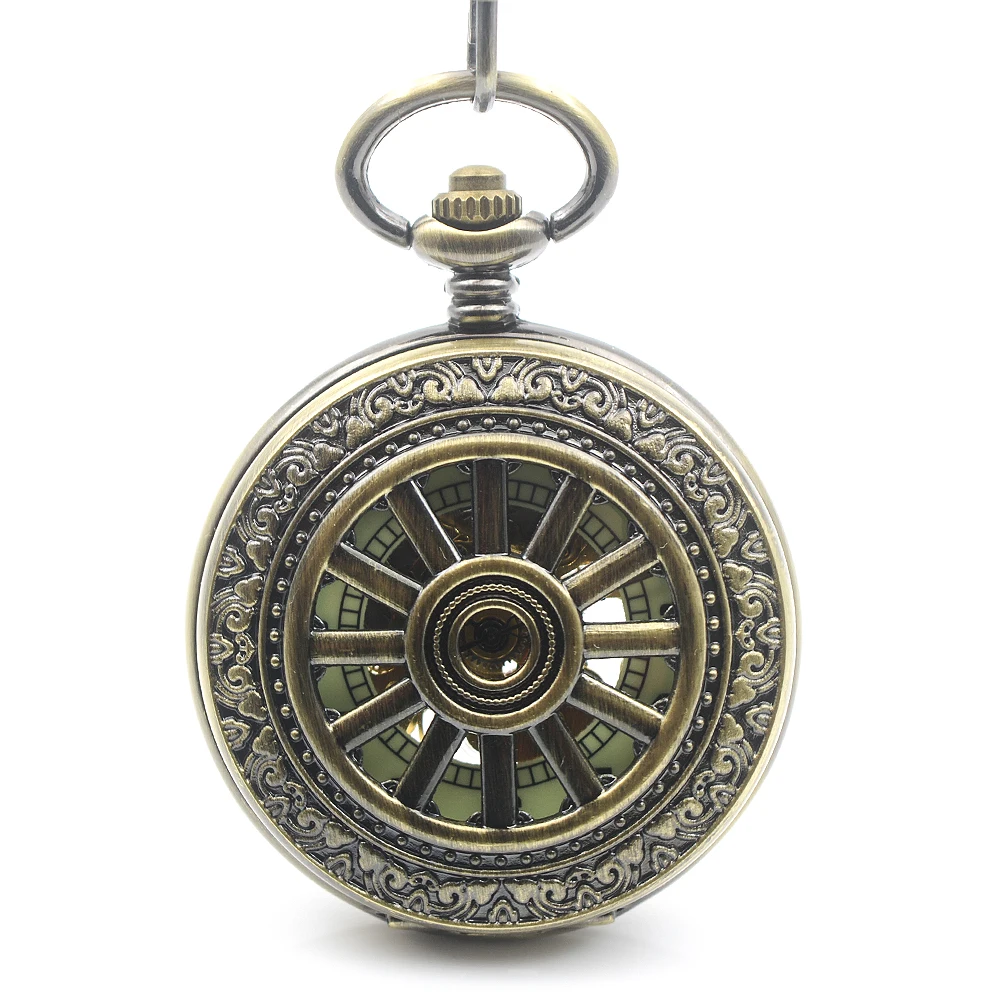 Vintage Style Glow Dial Wind Up Mechanical Mens Pocket Watch W/ Chain Bronze Tone Hollow Case Skeleton Steampunk WatchMain Features: