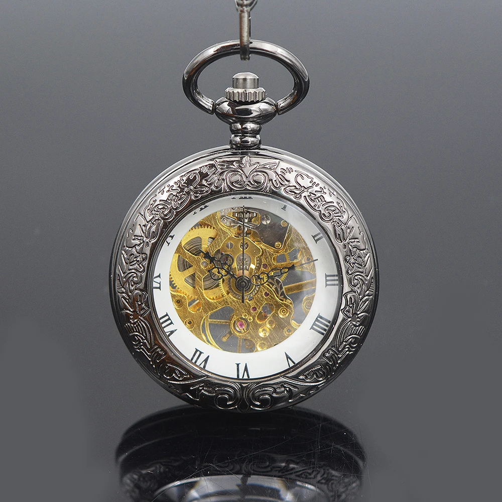On-time Delivery: If you do not receive your purchase within 60 days, you can ask for a full refund before order completion (when you click "Confirm Order Received" or exceed confirmation timeframe).Big Stock Clearance Luxury Black See Though Case Steampunk White Dial Roman Number Hand Wind Mechanical Mens Pocket Watch w/Chain Nice Gift
