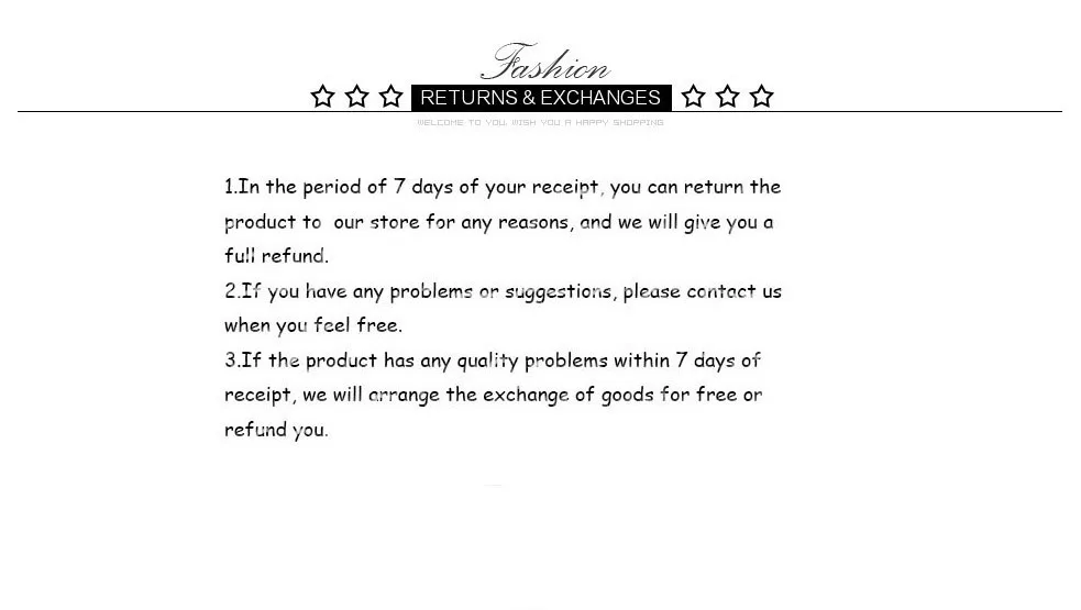 If the product you receive is not as described or low quality, the seller promises that you may return it before order completion (when you click "Confirm Order Received" or exceed confirmation timeframe) and receive a full refund. The return shipping fee will be paid by you. Or, you can choose to keep the product and agree the refund amount directly with the seller.N.B.: If the seller provides the "Longer Protection" service on this product, you may ask for refund up to 15 days after order completion.
