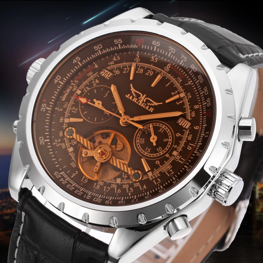 On-time Delivery: If you do not receive your purchase within 60 days, you can ask for a full refund before order completion (when you click "Confirm Order Received" or exceed confirmation timeframe).Hurry! Promotion Jargar Mens Watch Casual Autoamtic Tourbillon Steampunk Transparent Genuine Leather Anglog Wristwatch Color Black
