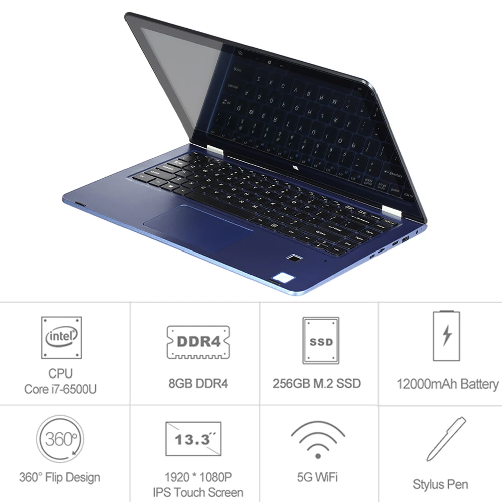 VOYO A3PRO Windows 10 Laptop Tablet PC Core i7-6500U Notebook 13.3 inches IPS 1080P Touch Screen 8GB DDR4 256GB SSD Dual Band WiFi Bluetooth 4.0 12000mAh Battery with Stylus Pen EU Plug