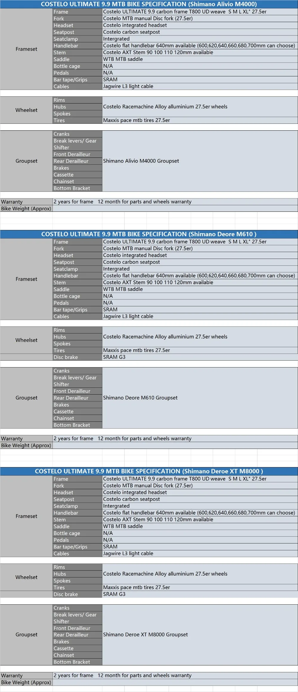costelo Ultimate 9.9 bicycle MTB Frame carbon Bicylce Mountain Bike Ultralight 27.5 MTB Frame original groups wheels saddle bar tire