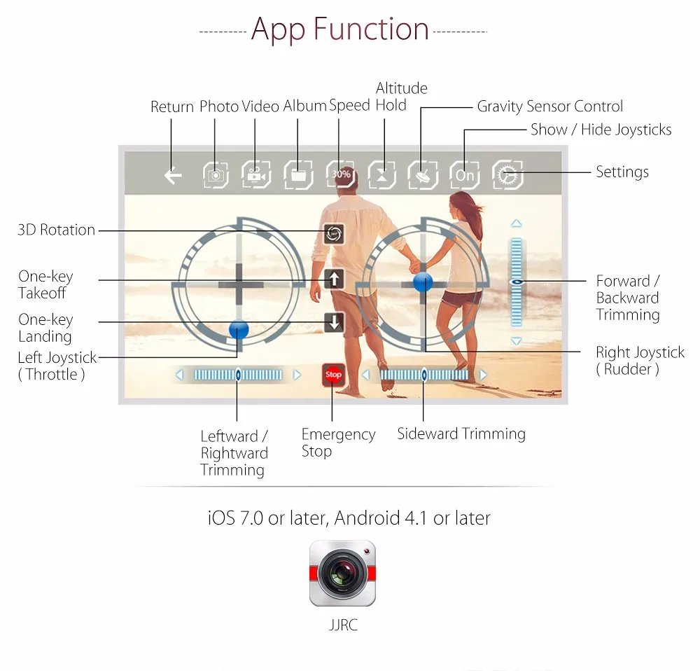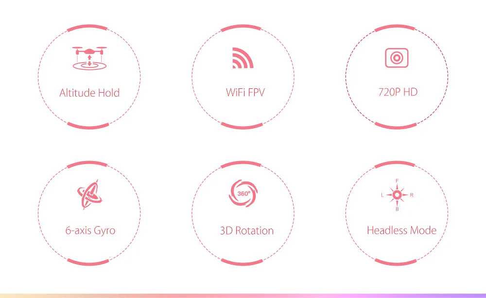 Functions:3D rollover,Camera,Forward/backward,FPV,Gravity Sense Control,Headless Mode,One Key Taking Off,Sideward flight,Turn left/right,Up/down,WiFi Connection,With light