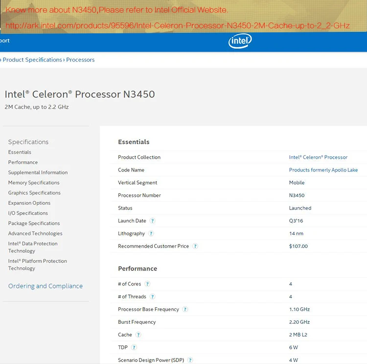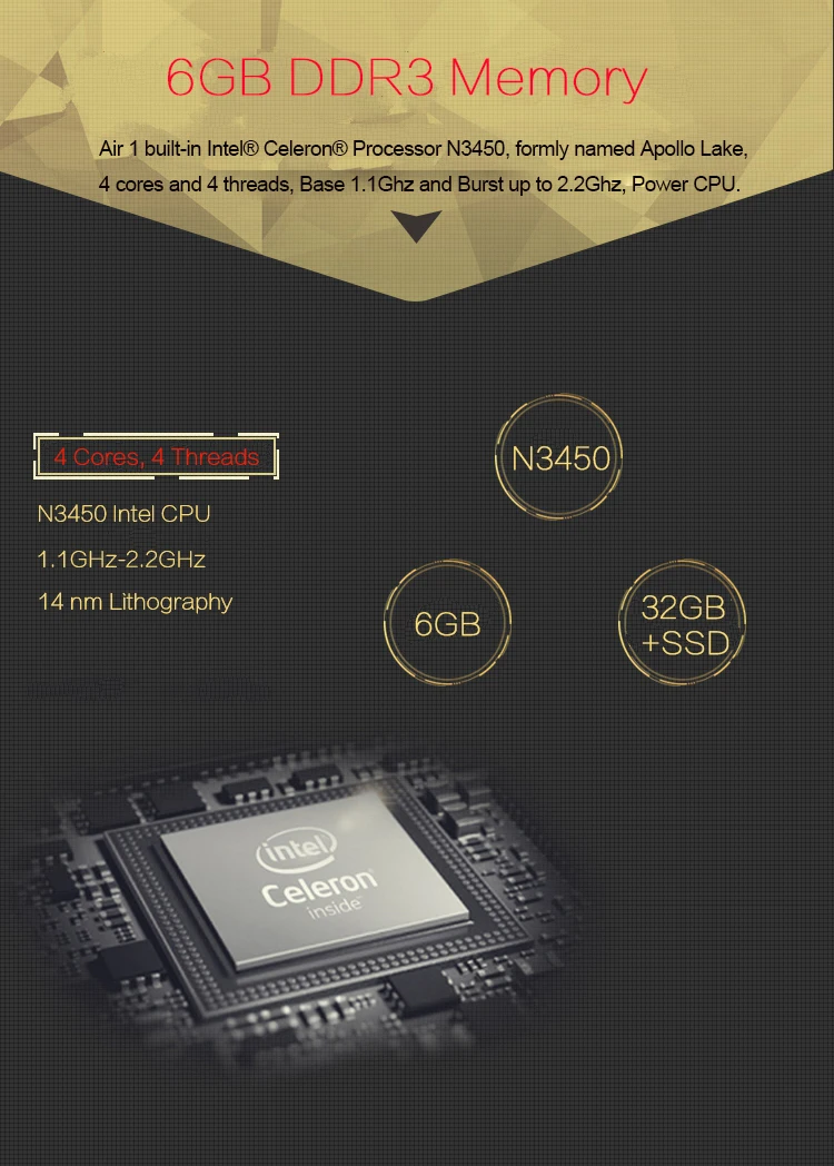 CPU | Celeron N3450 Turbo Burst 1.10GHz, up to 2.2GHz,Quad Core Quad Threads, 2M Cache |
