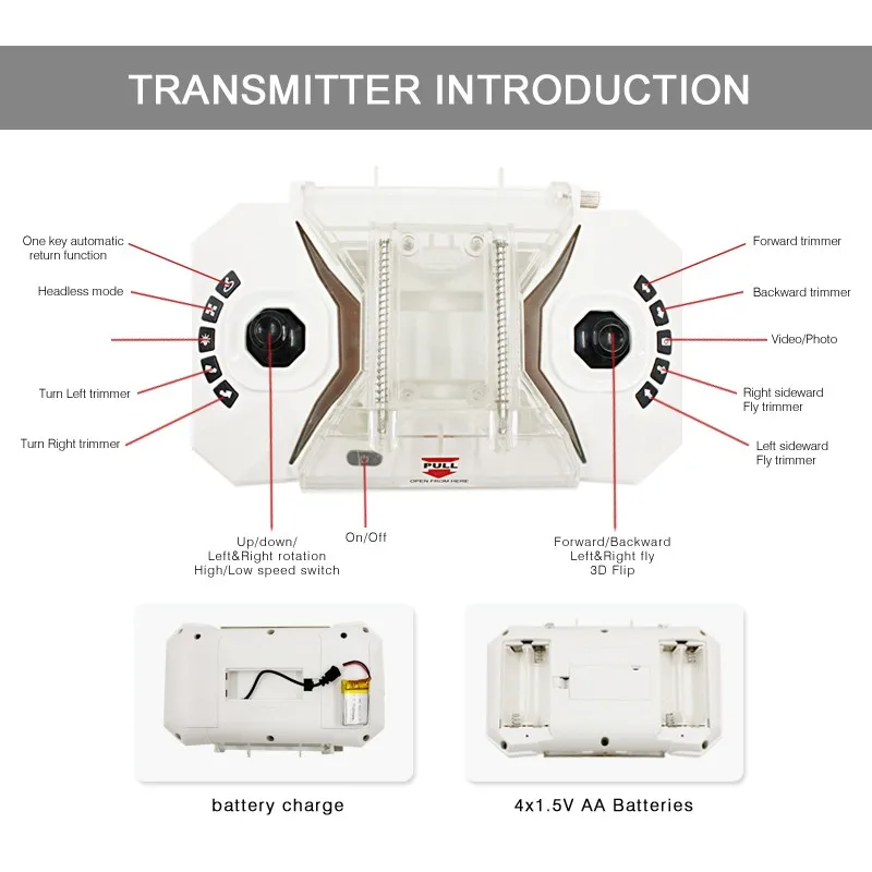 3. One key to return5. Throw the takeoff6. Cool Light7. forward and back, left and right , left and right side fly, rise and fall8. The vehicle can be charged on the remote control9. The battery, camera can be replaced10.Foldable arm ,easy to take11. Low voltage protection functionPackage listing: