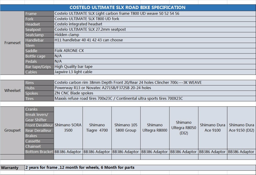 On-time Delivery: If you do not receive your purchase within 60 days, you can ask for a full refund before order completion (when you click "Confirm Order Received" or exceed confirmation timeframe).Excellent Deals Costelo Ultimate SLX Carbon road bicycle H11 handlebar complete bike 38mm carbon clincher bob color 3k wheels saddle tires