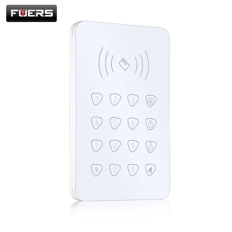 1) RFID function. In total, keypad can store 5 pieces different RFID card.2) Micro-computer control, stable performance3) LED indicator for arm/disarm/home arm,etc.4) It works with the alarm host to carry out the functions of arming/disarming/emergency remotely5) Password protection for home owner6) Build-in 4 pieces AAA battery, can last at least 1 year7) Automatically data saving when power off8) Battery low voltage SMS alert function.9) One-Key programming password recovery function Packages:Wireless keypad * 1