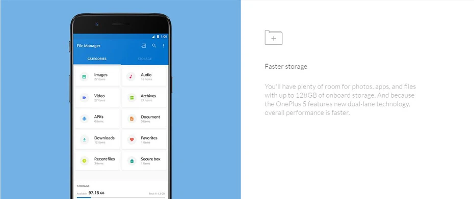 Faster storage Youll have plenty of room for photos, apps, and files with up to 128GB of onboard storage. And because the OnePlus 5 features new dual-lane technology, overall performance is faster.